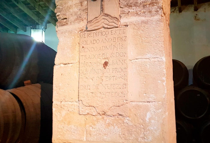 En una de las columnas de piedra vieja, que sostiene los arcos de medio punto de la bodega de dos calles, se encuentra un escudo esculpido en la piedra y una inscripción sobre la lápida. En el escudo, una cruz sobre unas olas, la cruz del mar, y en la inscripción se lee que fue reedificada –por tanto, tenía que existir antes– en el año 1767. Esta fecha y la cruz sobre las olas, definieron el nombre de su vino: de la Cruz de 1767.