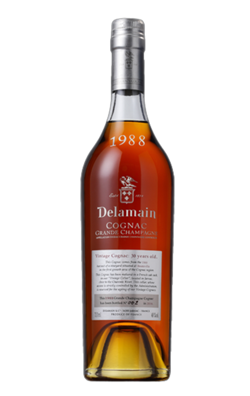 Delamain Millésimé 1988 é um conhaque elaborado a partir de uma colheita específica, algo incomum na elaboração deste tipo de bebida, uma vez que a maioria adiciona aguardentes de diferentes colheitas para obter uma certa uniformidade. Para isso, são selecionados pequenos lotes que, após anos de envelhecimento em barrica, são colocados à venda. Foi o caso desta colheita de 1988, que chegou ao mercado 30 anos depois. Provém de uma única vinha do município de Bouteville e apresenta-se numa degustação extremamente complexa, revelando notas de frutos de caroço, como alperce ou lichia, bem como toques de couro e baunilha. Ideal para desfrutar e saborear tranquilamente numa longa sobremesa.