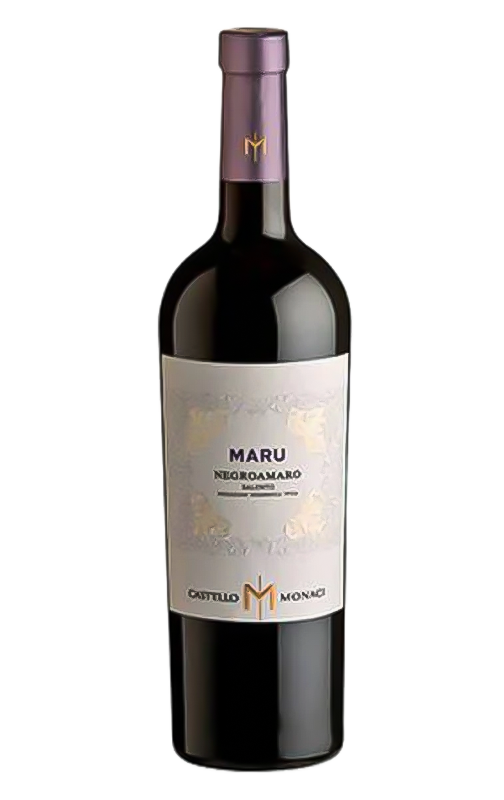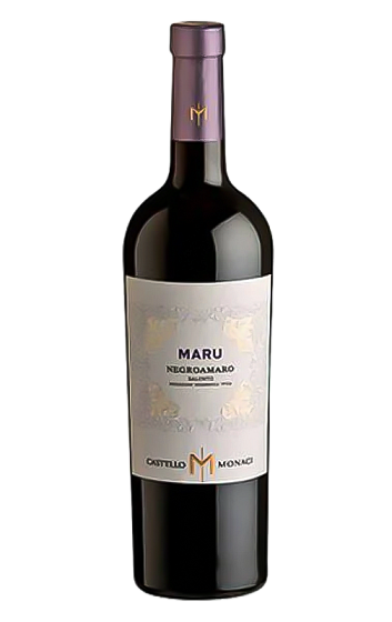 Castello Monaci Maru é um vinho monovarietal de Negroamaro, originário de Salento. O seu leve envelhecimento em barrica durante 6 meses não mascara o aroma frutado desta uva típica da Puglia, caracterizada pela sua grande concentração de frutos pretos, como groselha, amora e cereja, e ervas mediterrânicas. O seu paladar é potente, com um final ligeiramente amargo, daí o seu nome.