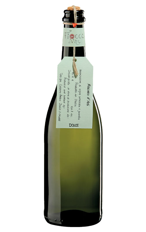 Toso Moscato d'Asti DOCG Fiocco di Vite é um vinho piemontês fácil de beber, elaborado com a variedade Moscatel de grão pequeno, muito comum no Piemonte, onde é conhecido como Moscato d'Asti. É um espumante doce, frutado e muito aromático. De bolhas finas e elegantes, é perfeito para a sobremesa