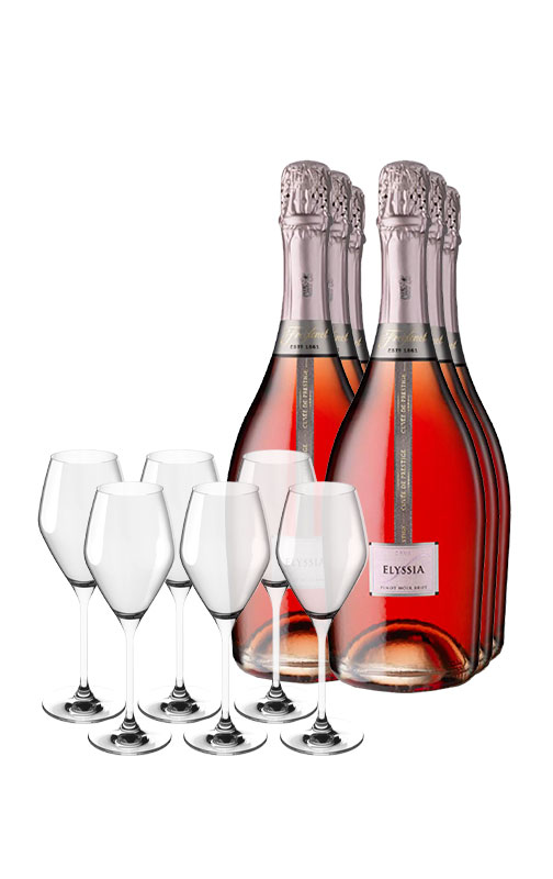 Um pack perfeito para ter em casa 6 garrafas de Elyssia Pinot Noir Brut de uma de las grandes casas de cava, com 6 copos serigrafados gratuitos.